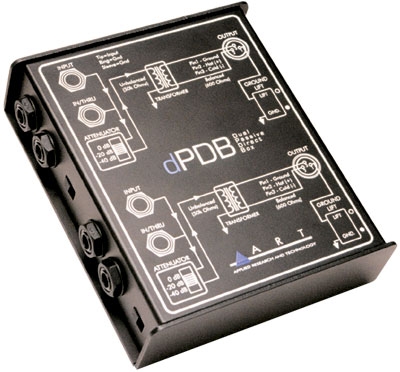 ART dPDB je dvoukanálovou verzí Direct boxu ART PDB. Jde o vysoce kvalitní pasivní direct box, který vám umožní propojit linkový, nástrojový nebo dokonce zesílený signál určený pro reproduktory s mixážním pultem nebo jiným zařízením se symetrickým vstupem. Signál z jednoho z vysokoimpedančních vstupních 1/4“ Jacku je transformátorem překonvertován na symetrický nizkoimpedanční signál. dPDB v sobě kombinuje široký frekvenční rozsah a schopnost zpracovávat i zesílený signál, díky čemuž nabízí čistý a transparentní zvuk, což oceníte zejména v rušných podmínkách, např. při živém vystupování. dPDB navíc nabízí funkci Ground lift.