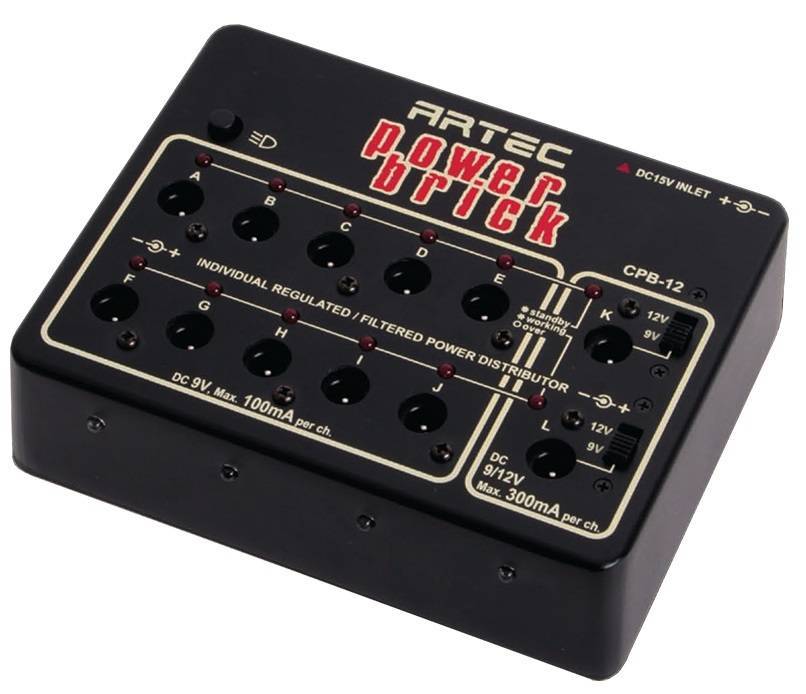 Napájecí zdroj vhodný pro napájení efektových pedálů. Artec Power Brick nabízí napájení dohromady až pro 12 pedálů. Každý z výstupů je samostatně odfiltrován. Prvních 10 výstupů nabízí napětí 9V a maximální proud 100 mA při polaritě center negative. K dispozici je i dvojice přepínatelných výstupů pro napájení 9 nebo 12V pedálů s polaritou centr negative a maximálním proudem do 300 mA. Každý výstup je vybaven signalizační LED diodou, která signalizuje jeho správné fungování. Po bocích zdroje se nacházejí 4 jasné LED diody, které lze zapnout nebo vypnout pomocí tlačítka na horním panelu. Rozměry: 93 x 123 x 48 mm. Hmotnost: 350 g. Barevné provedení: Black.