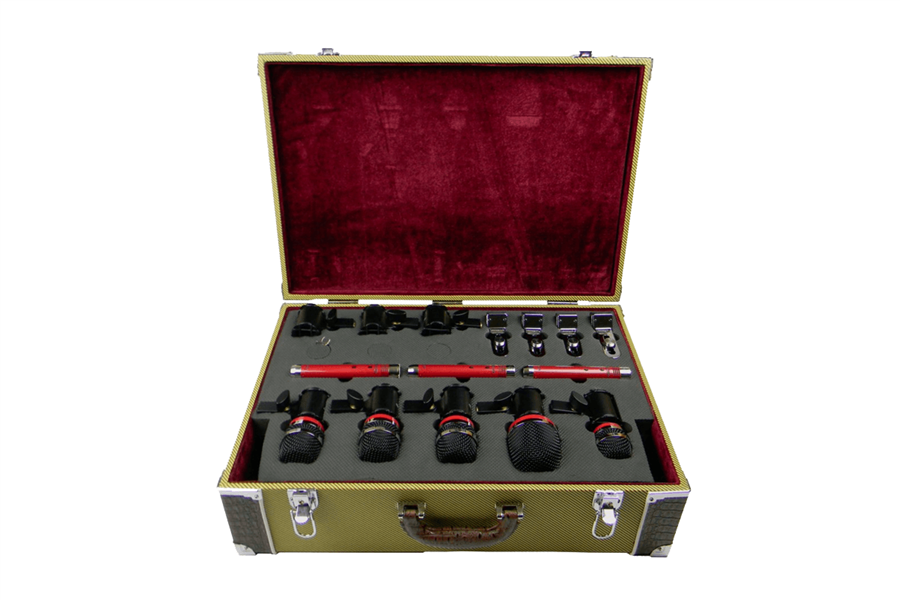 Sada mikrofonů na bicí. 8 mikrofonů8 mikrofonů včetně odpružených držáků a držáků na okraje bubnů.Dodáváno v prfektně padnoucím designovém Tweed kufru.Bicí mikrofony Avantone CDMK jsou skutečně nádherně vypadající a znějící mikrofony. Unikátní vlastností všech dynamických bubnových mikrofonů řady Avantone CDMK je dvojice žlábků na těle mikrofonu. Tyto žlábky umožňují, aby O-kroužky odpruženého držáku SSM „zajistily“ mikrofon na místě, což zabrání jeho posunutí a sklouznutí.