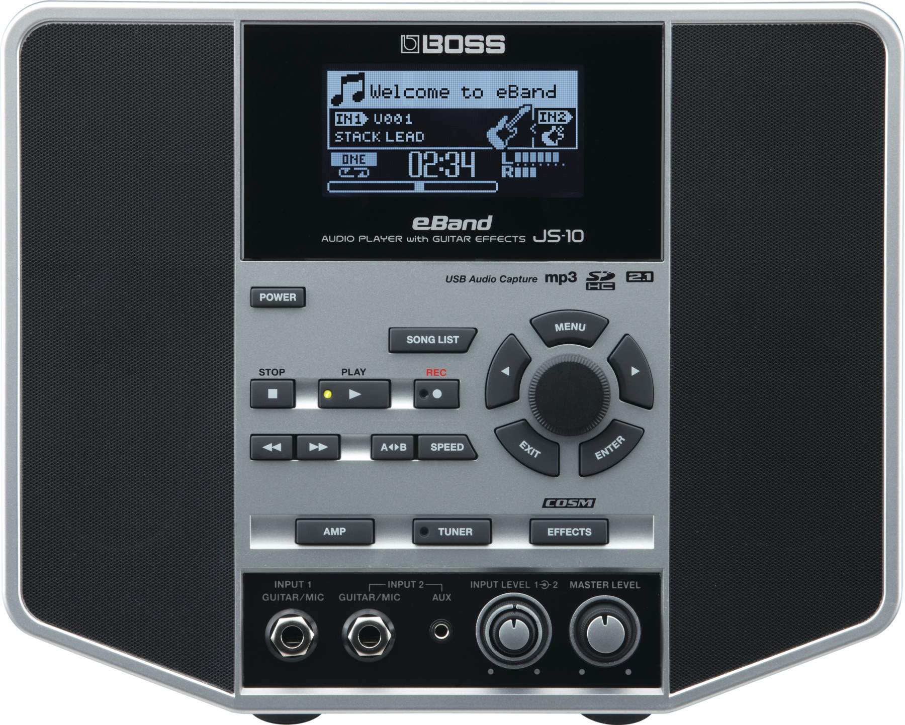 Zároveň eBand obsahuje multiefekt využívající technologie COSM, díky čemuž je v podstatě totožný s multiefektem GT-100 – vlajkovou lodí firmy Boss. Kromě standardních efektů jsou obsaženy i simulace aparátů a reproboxů, aby zvuk byl opravdu zcela autentický. Vzhledem k tomu, že JS-10 má dva vstupy a dvě nezávislé signálové cesty, je možné ho bez problémů používat ve dvou!