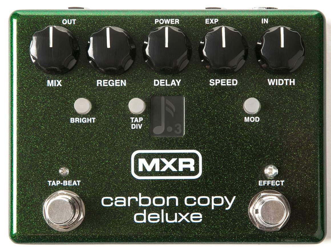 Carbon Copy Deluxe je rozšířenou verzí populárního analogového delaye Dunlop MXR Carbon Copy. Nabízí maximální delay time až 1200 milisekund, možnost externího ovládání expression pedálem a přidanou funkci Tap Tempo. K jejímu ovládání slouží nožní spínač Tap-Beat a tlačítko Tap-Division s frázováním v tečkovaných osminách, osminách, triolách a šestnáctinách.