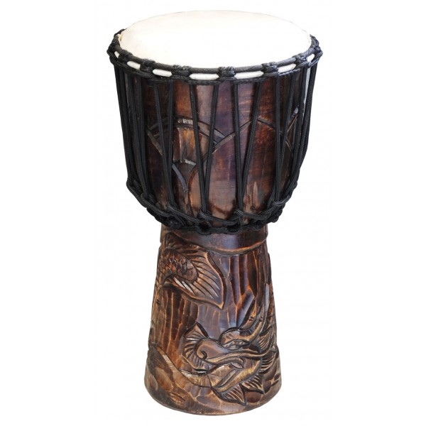 Velmi krásně zpracované djembe vyrobené z kvalitního výběrového mahagonu, bez maleb jen s lakováním. Celý korpus je nádherně vyřezávaný krásnými různorodými motivy. Jsou vyrobeny v Indonesii, a proto se v řezbách objevují tradiční motivy vycházející z tamní kultury. Pro dosažení co nejlepšího zvuku se používá kvalitně zpracovaná kozí kůže.