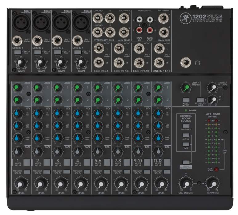Konkrétně 1202-VLZ4 je kompaktní 12kanálový mixpult, který nabízí 12 linkových vstupů a 4 mikrofonní vstupy, kdy u mikrofonních jsou použity kvalitní předzesilovače Onyx, které můžete znát z nejvyšších řad Mackie. Ty nabízí až 60 dB rozsah gainu, díky čemuž je možné v dynamickém rozsahu dostat až na 128,5 dB. Zajišťují to nejvěrnější zesilení signálu na všech frekvencích a minimální úroveň zkreslení. Samozřejmě nabízí i phantomové napájení při použití kondenzátorových mikrofonů.