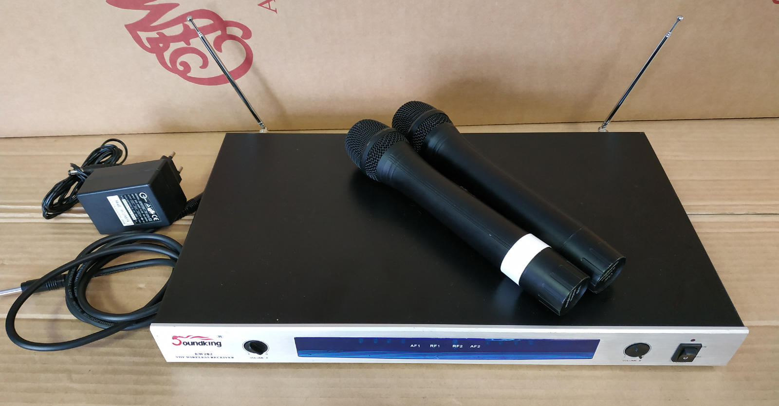 Sada bezdrátových mikrofonů Soundking EW202, 2x handka + přijímač. Jeden kanál hraje slabě - signál je tak na 20%.