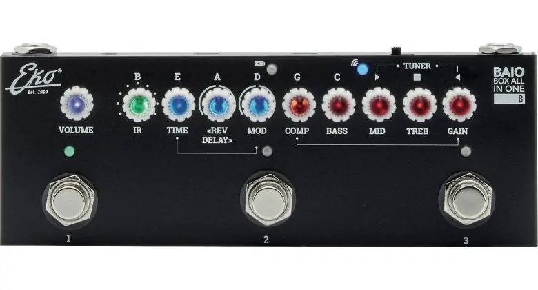 Eko Guitars BAIO B (Box All In One) je multiefektový pedál se zabudovaným IR pro elektrickou a akustickou baskytaru. Ve výbavě má 8 IR zesilovačů pro baskytaru, plné ovládání gainu a tónu, kompresor, chorus, phaser, reverb, delay, vestavěnou ladičkou s funkcí mute, nástrojový vstup a jack výstup, stereo sluchátkový výstup, připojení bluetooth a USB porty pro použití jako audio rozhraní pro PC/Mac i chytré telefony. Ideální pedál, se kterým budete mít své zvuky neustále u sebe.