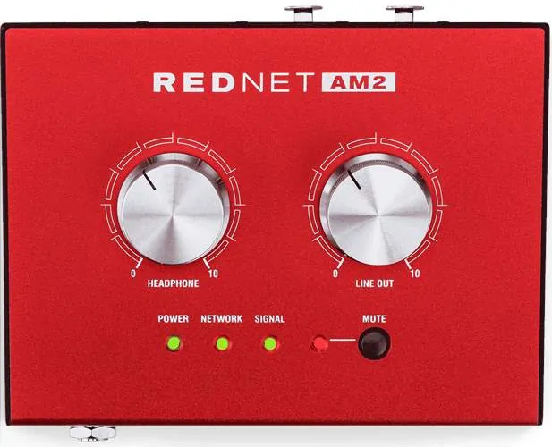 RedNet AM2 obsahuje dvoukanálový přijímač Dante založený na hardware "Ultimo" společnosti Audinate a obsahuje vysoce kvalitní převod digitálního signálu na analogový při standardních vzorkovacích frekvencích od 44,1 do 96 kHz přičemž oba výstupy nabízejí lepší dynamický rozsah než 118 dB. Jednotka může být taktována buď interně, nebo přes Dante Network Master. Dva velké knoflíky pro ovládání hlasitosti jsou určeny pro úrovně sluchátkového a linkového výstupu, přičemž druhý z nich je vybaven tlačítkem pro ztlumení zvuku s příslušnou LED diodou. Další indikátory ukazují přítomnost napájení, sítě a signálu. Indikátor signálu svítí červeně při 0 dBFS, oranžově při -6 dBFS a zeleně při -42 dBFS na obou kanálech, zatímco indikátor sítě se rozsvítí, když je na portu 1 nebo 2 přítomno platné síťové připojení.