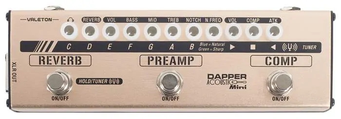 Dapper Acoustic Mini je malý podlahový multiefekt pro akustickou kytaru s intuitivním uživatelským rozhraním a třemi samostatnými efektovými sekcemi – kompresorem s možností nastavení intenzity a rychlosti nástupu komprese, předzesilovačem s třípásmovým ekvalizérem a ovladači pro boj s nežádoucím efektem zpětné vazby a one-knob sekcí efektu Reverb. Podlahový efekt dále nabízí integrovanou ladičku, symetrický XLR výstup pro vyvedení signálu do mixu či zvukovky nebo sluchátkový výstup s vlastním ovladačem hlasitosti výstupu a cab simulací. K napájení multiefektu slouží 9V adaptér.